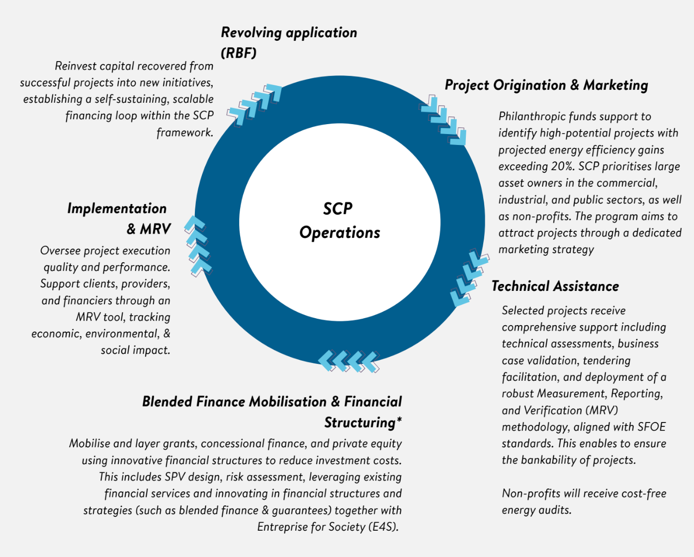 Servetia 2.0, or “Servetia Catalytic Platform (SCP)”, will support renewable and energy-efficiency projects first-hand, while addressing the key barriers that building owners and end users face – from performance risks, limited internal capacity, lack of technical support, complex procurement, and financing misaligned with operational needs.